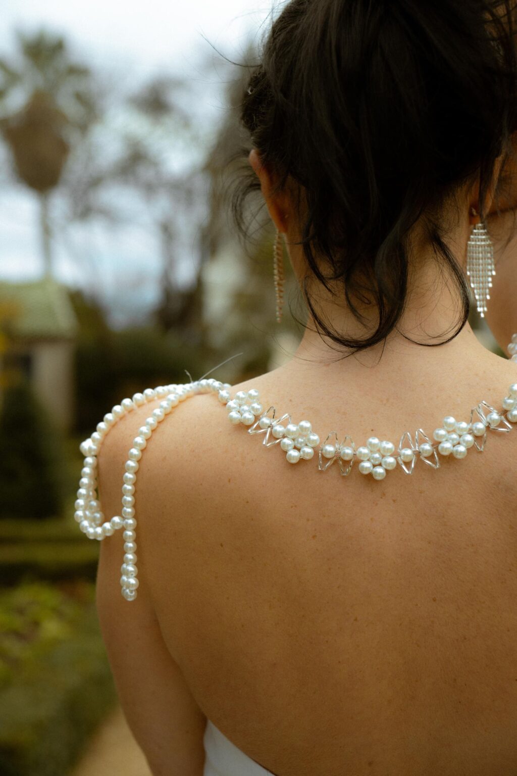Une robe de mariée princesse à grands plis, décolleté tulle de coton brodé et perlé main & une parure de perles de verre.