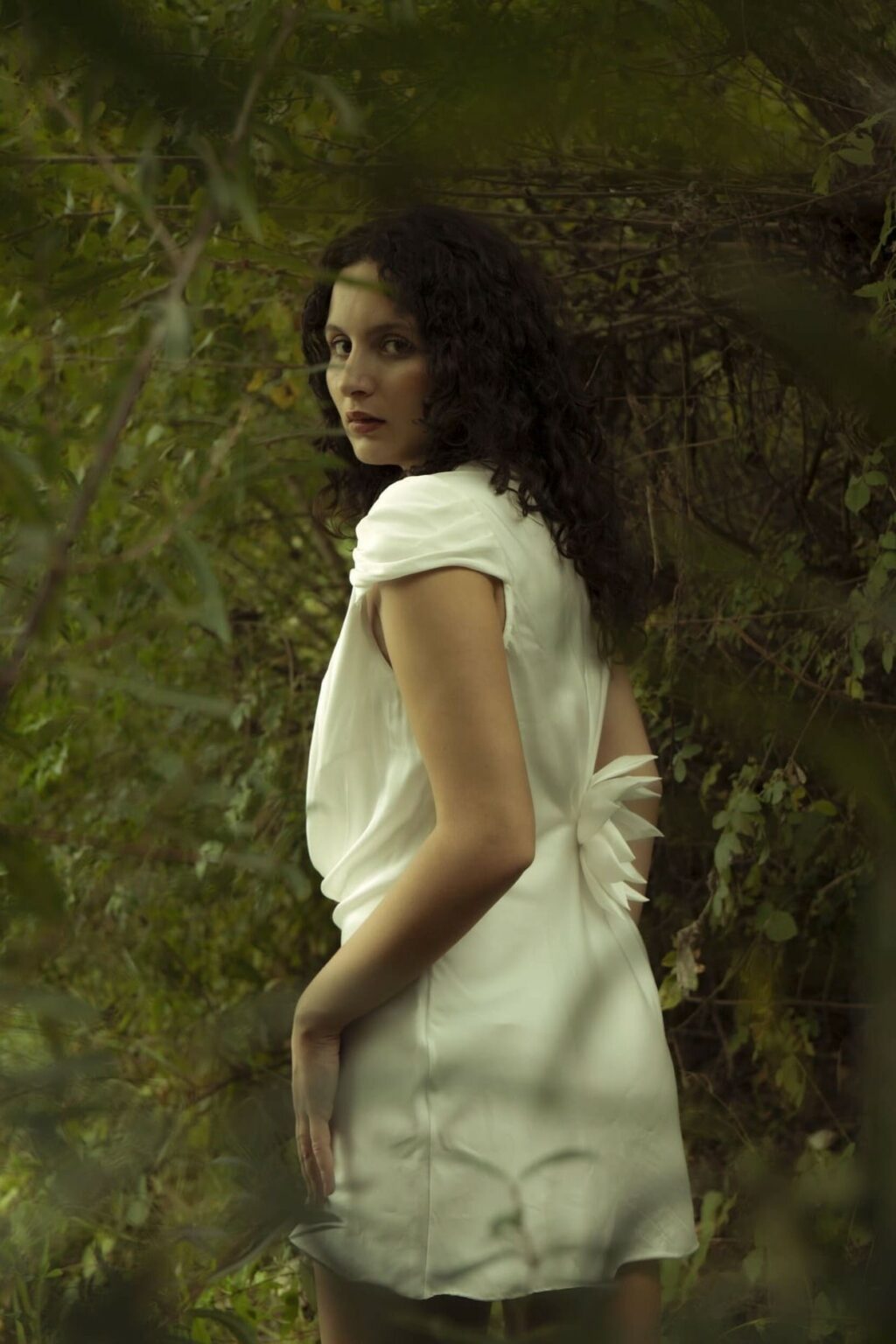 Robe blanche de noces en satin de soie, drapant délicatement les contours de la silhouette. Au dos trône une majestueuse nymphéa.
