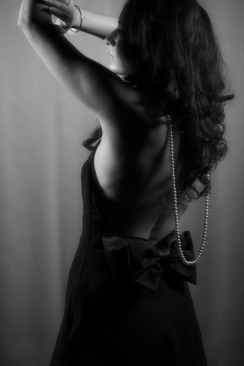 Petite robe noire dos nu évasée, chute de perles de verre & gros noeud façon smoking au creux des reins.
