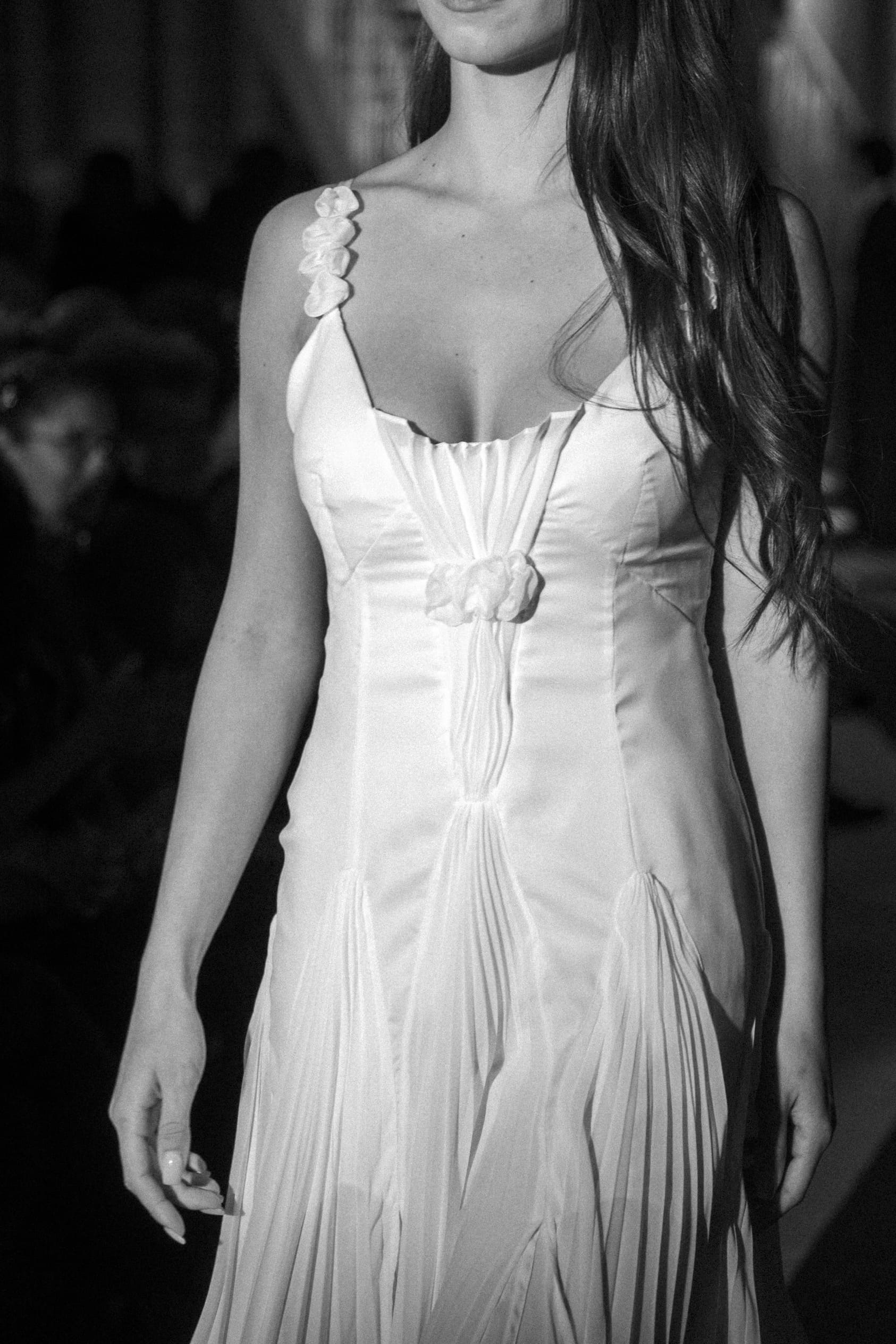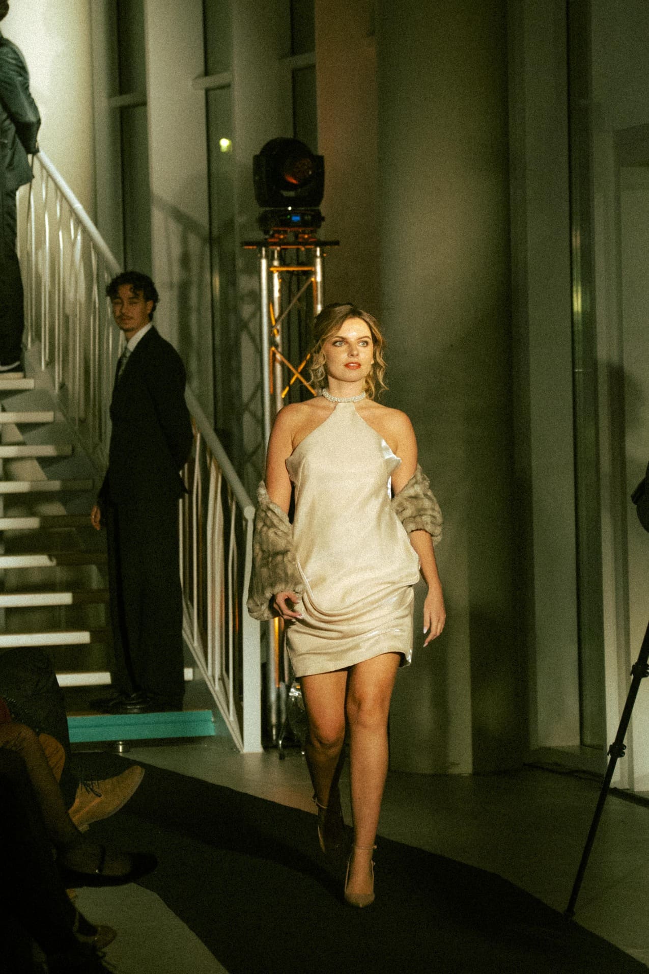 - Une robe satin nude drapée à décolleté dos perlé avec son collier ras de cou et étole baleinée en fourrure synthétique