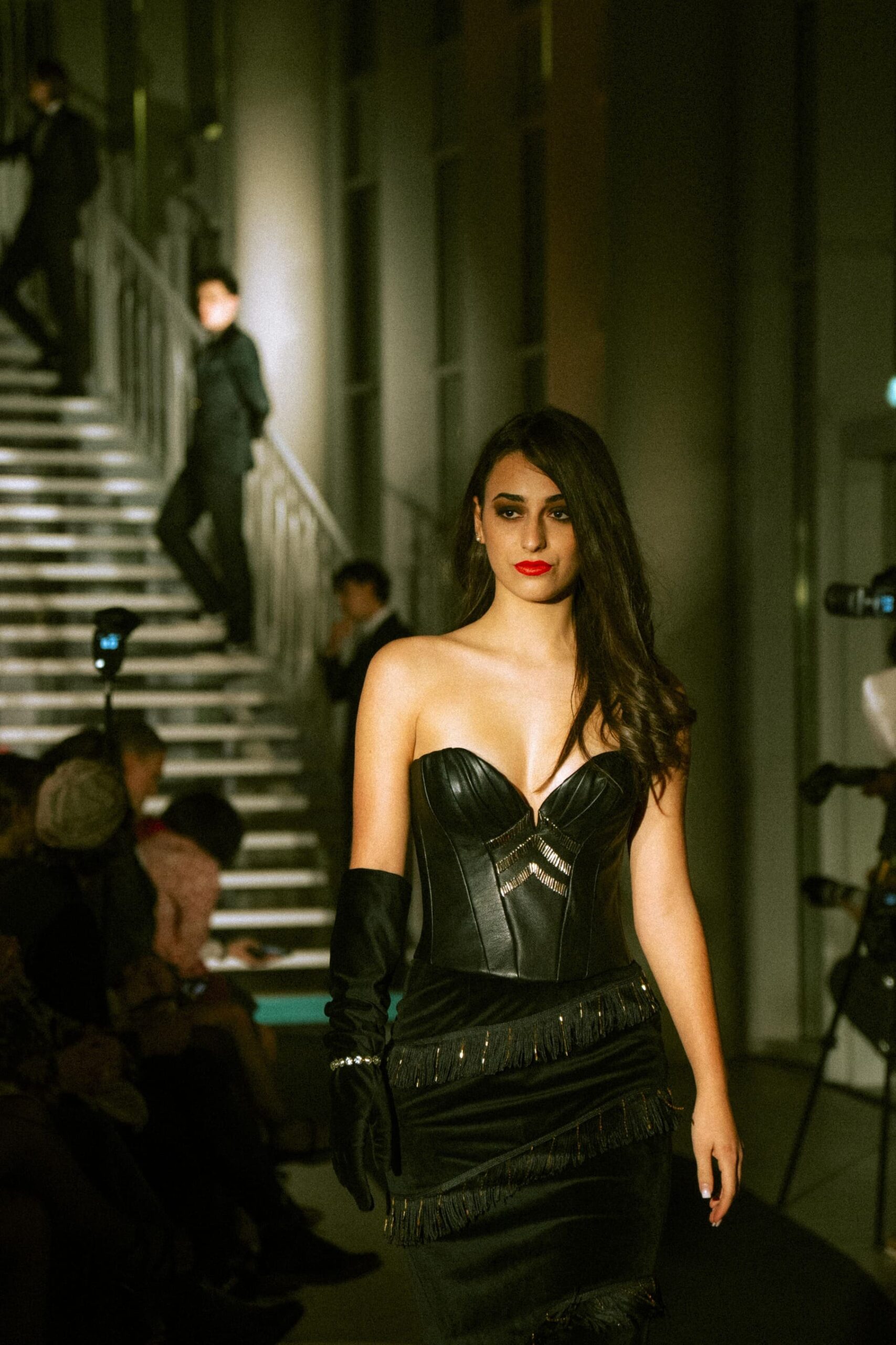 - Un corset coton et lin recouvert de cuir et sequins avec sa jupe sirène en velours ras frangées et perlées
